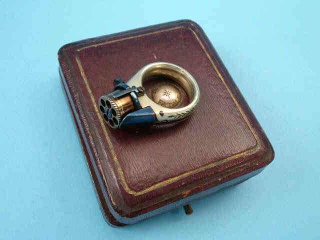 A six shot version of the ring pistol. R. M. Maylett designed the smallest pistol of the time and originaly was not created to be a ring pistol and the cut out hole was merely the best way to get a firm grip on such a small gun